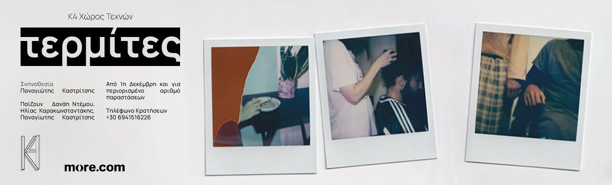 Για την πρώτη εξόρμηση της Ομάδας Θεάτρου επιλέξαμε την παράσταση Τερμίτες, που σκηνοθετεί ο δικός μας Πάνος Καστρίτσης, καθηγητής του Θεατρικού Παιχνιδιού στις δραστηριότητες του σχολείου μας, σε μια σκηνή της γειτονιάς μας, την ΧΩΡΟΣ Κ4 (ΟΙ ΑΝΘΡΩΠΟΙ ΠΟΥ ΑΚΟΛΟΥΘΟΥΝ ΤΗ ΓΗ) - ΘΕΑΤΡΟ (Βεΐκου 28), την Κυριακή 9 Φεβρουαρίου στις 19:30.